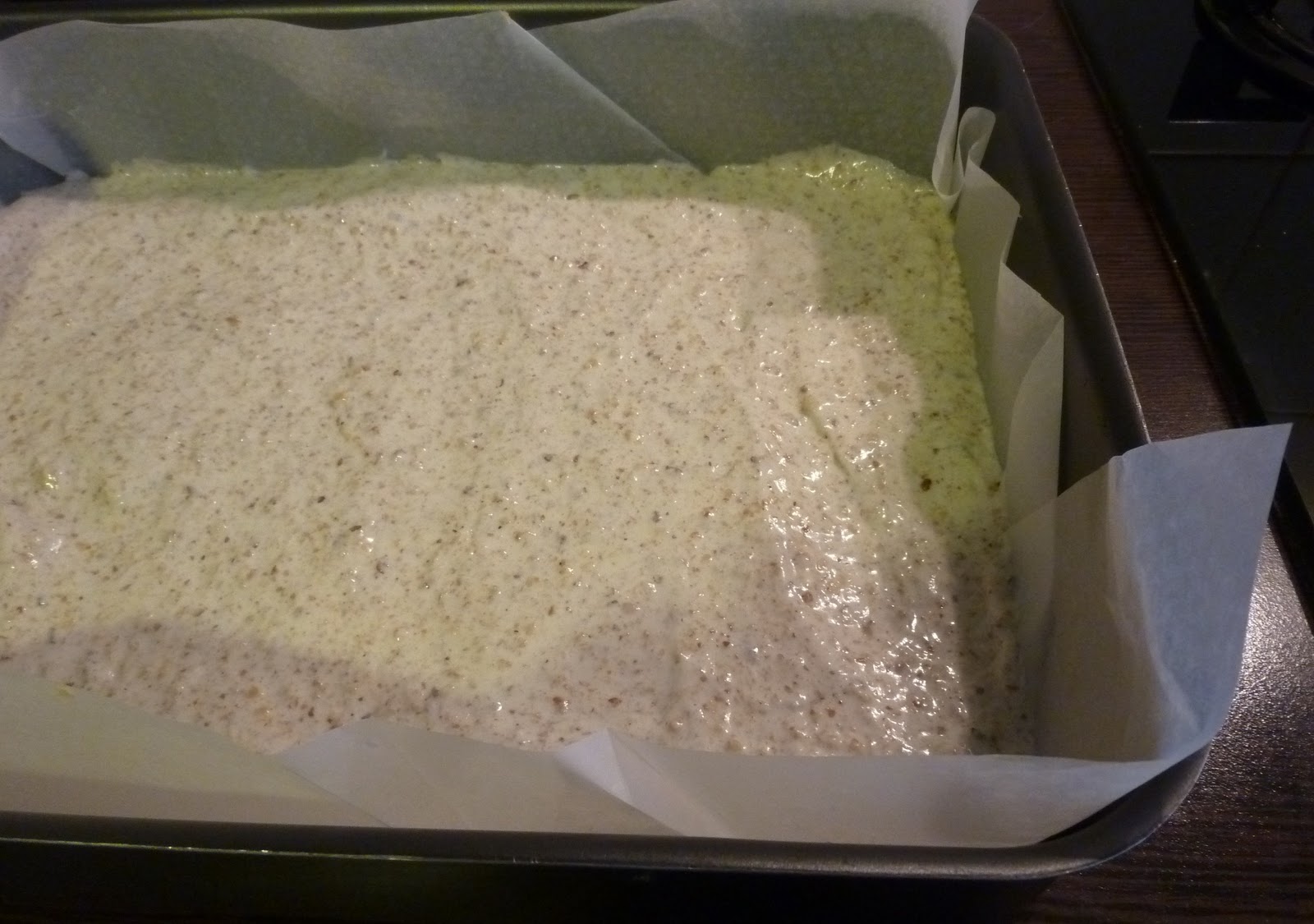 Indepartam hartia de copt, asezam blatul pe o tava si intindem ciocolata alba topita deasupra. Reteta spune ca trebuie sa razi ciocolata deasupra dar eu nu sunt prietena cu razatoarea (mi-am ras degetele de nenumarate ori :)) asa ca am topit-o si am intins-o cat s-a putut de uniform. Apoi lasam blatul sa se raceasca.